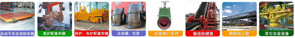 公司產(chǎn)品有ZT系列鐵水罐車、鋼包車、渣罐車、渣盤車、電動(dòng)平車、過跨車、鐵水稱量車、液壓傾翻車、廢鋼料籃車、中間罐車、修爐車、爐底車、鎳鐵礦熱爐料罐車、汽運(yùn)鐵水車以及各種鐵水罐(包)、鋼水包(罐)、渣罐、渣盤、中間罐、鋼包加蓋、龍門吊鉤、鋼包傾翻機(jī)、鋼包回轉(zhuǎn)臺(tái)等產(chǎn)品。